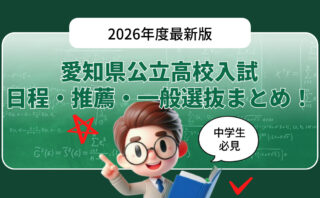受験情報 【2026年度最新版】愛知県公立高校入試の日程・推薦・一般選抜まとめ!中学生必見 2026年度(令和8年度)愛知県公立高校入試の最新情報まとめ。推薦選抜・一般選抜の日程、出願期間、合格発表日、受検配慮や長期欠席者への対応もわかりやすく解説。中学生と保護者必見の受験対策ガイド! 2025.10.05 受験情報